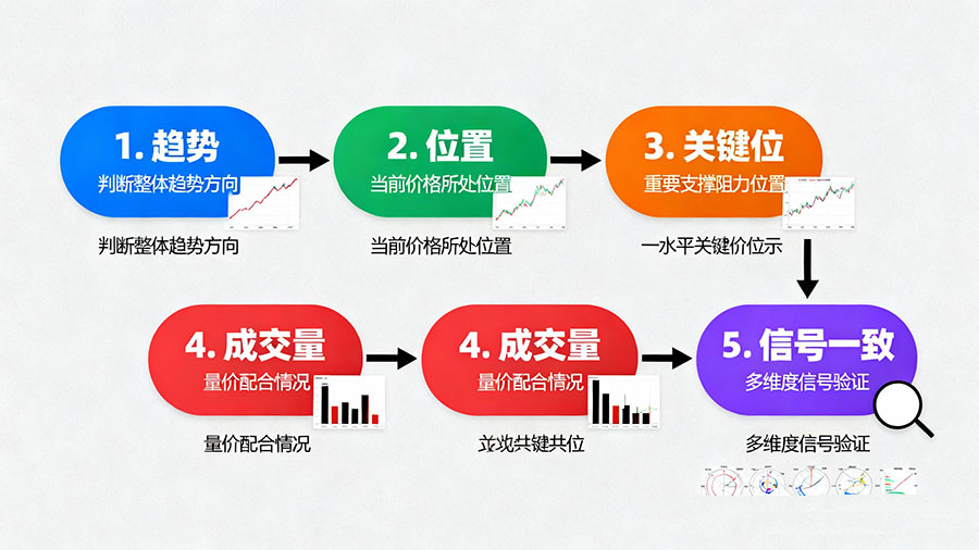 Step 5:等待信号一致——当“K线形态”与“趋势结构”、“关键位置”都发出同一方向信号时,才是最佳行动时机。