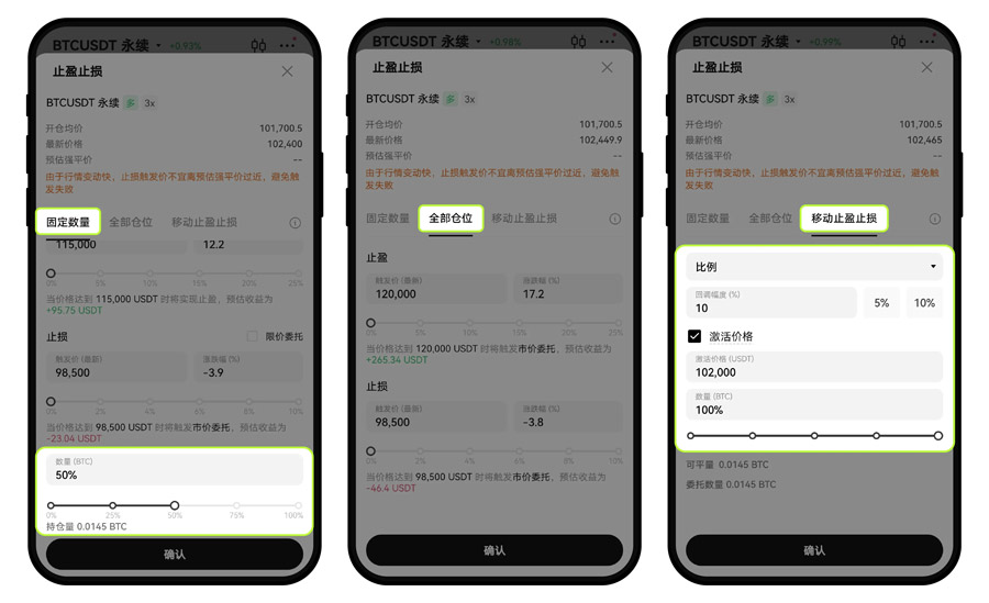 支持追踪止盈止损、部分平仓止盈等高级模式,提供更精细的风险收益管理。